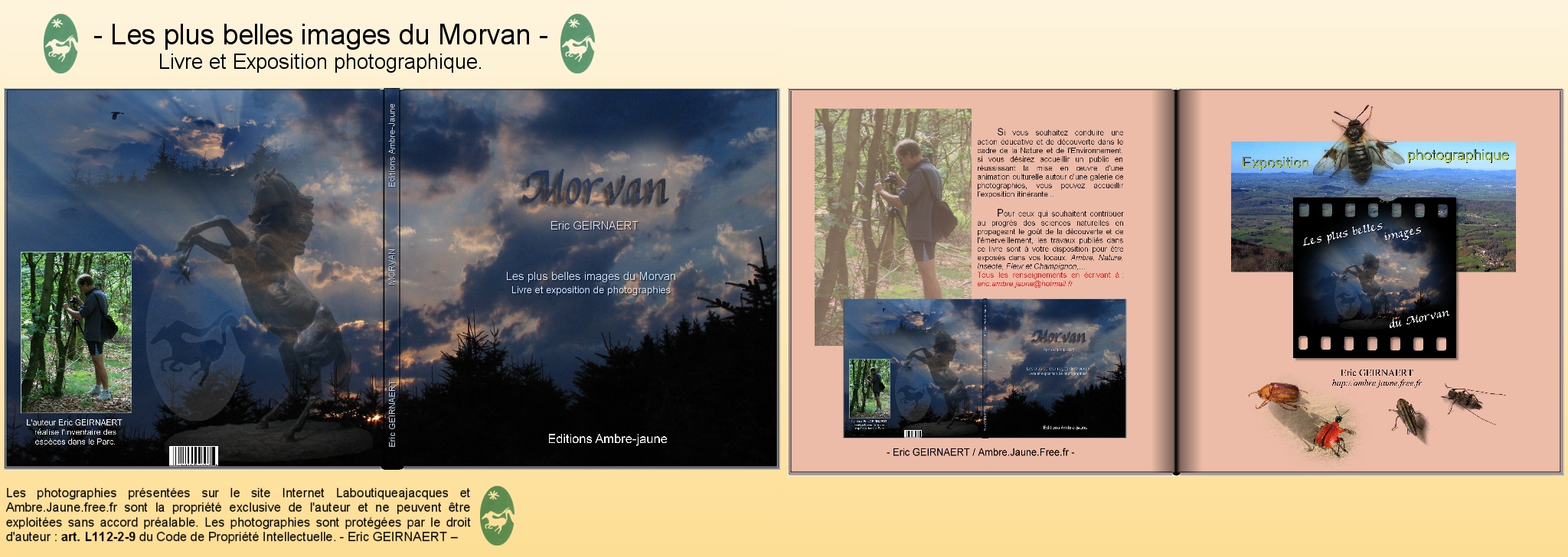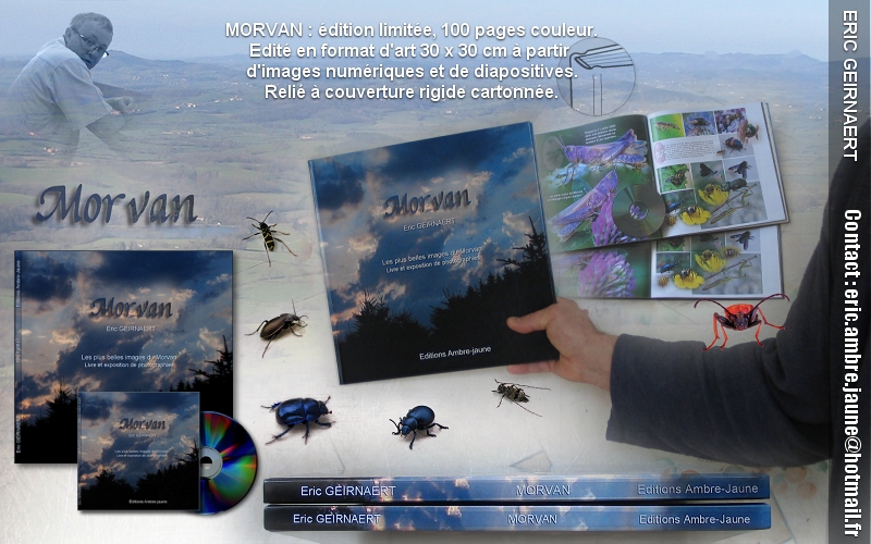 Tout naturaliste curieux qui découvre la biosphère des richesses naturelles dans les sites du Morvan est immédiatement frappé par la variété des formes, la richesse des couleurs et par l'extraordinaire contraste des éléments. D'aucuns de dire que les paysages, ici, doucement vallonnés, sont merveilleux, beaux, surprenants, fascinants même... Et d'autres de rappeler que ces lieux abritent des "lutins farceurs" qui, sortis des forêts, précipitent les promeneurs dans les plans d'eau. Où est le vrai du faux ? Et si l'observation attentive des paysages du Morvan nous servait de guide pour mieux comprendre la vraie nature des lieux ? (* = le cheval est le logotype du Parc du Morvan). MORVAN, le livre présenté ci-dessous, accompagne l'exposition de photographies. |
