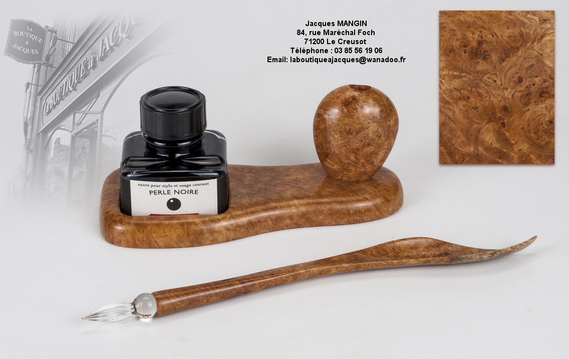 Selon la qualité des bois utilisés, (bois nobles à précieux) le coût d'une plume dans une configuration donnée varie de 10 à 15 euro. Si vous souhaitez une plume, fusion réussie des bois précieux et du verre filé, (dans un coffret utile lequel propose un buvard imprimé qui exprime l'origine des plumes fabriquées par les maîtres verriers) vous apprécierez le vaste choix des modèles proposés. Encriers ronds, encriers carrés, encriers avec capuchons bois, plumes verticales sur galet et socle, plume simple sans présentoir, ensemble deux plumes et encrier simple, ensemble plume simple avec deux encriers, ... si vous souhaitez connaître un prix téléphonez au 03 85 56 19 06). |